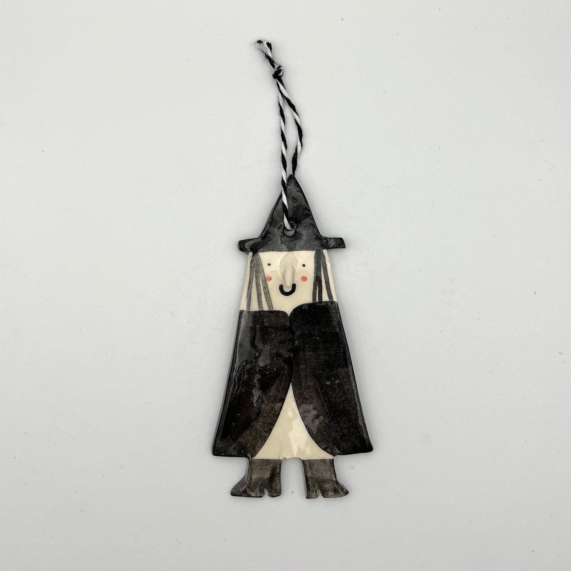 Handmade ceramic hanging Witch Ornament.